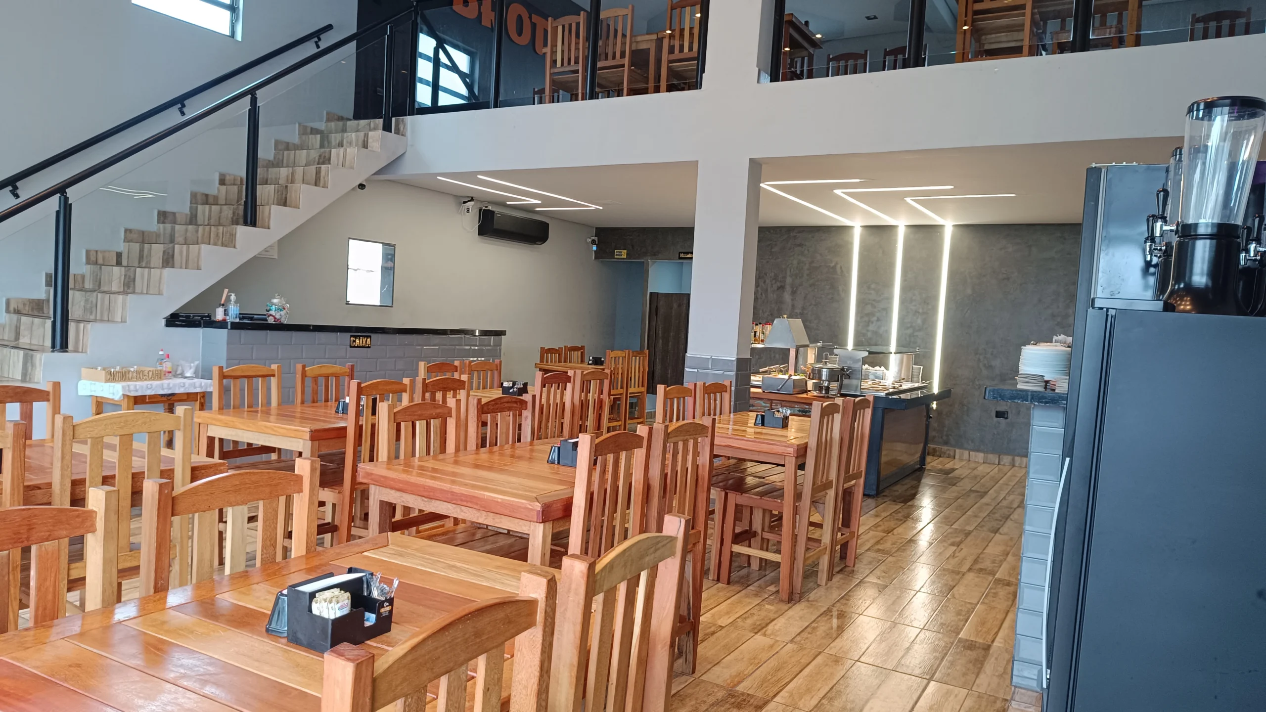 No térreo, um espaço amplo e integrado, ideal para o fluxo contínuo do rodízio ou para o livre acesso ao buffet. Mesas de madeira maciça estão dispostas de forma estratégica, garantindo circulação eficiente e proximidade com as estações de serviço.